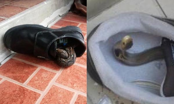 ช่วงหน้าฝนอย่างนี้ สัตว์เลื้อยคลานมักหนีฝนมาหลบซ่อนอยู่ในพื้นที่แคบๆ หนึ่งในนั้นคือรองเท้าที่เราถอดทิ้งไว้ โดยในโลกโซเชียลมีการแชร์ภาพถ่ายงูที่หลบซ่อนตัวในรองเท้า โดยมีการเตือนว่าก่อนจะหยิบรองเท้าขึ้นมาใส่ สำรวจดูสักนิดว่ามีสิ่งแปลกปลอมอะไรอยู่หรือไม่